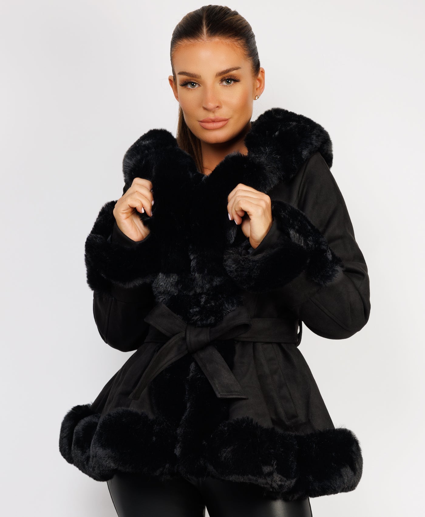 Faux Fur Trimmed Cuffs & Hem$Faux Fur Trimmed Hood$ Faux Suede (Suedette) Fabric$Hook & Eye Fastening & Fully Fur Lined$Our Model Holly Is Wearing a Size S/08