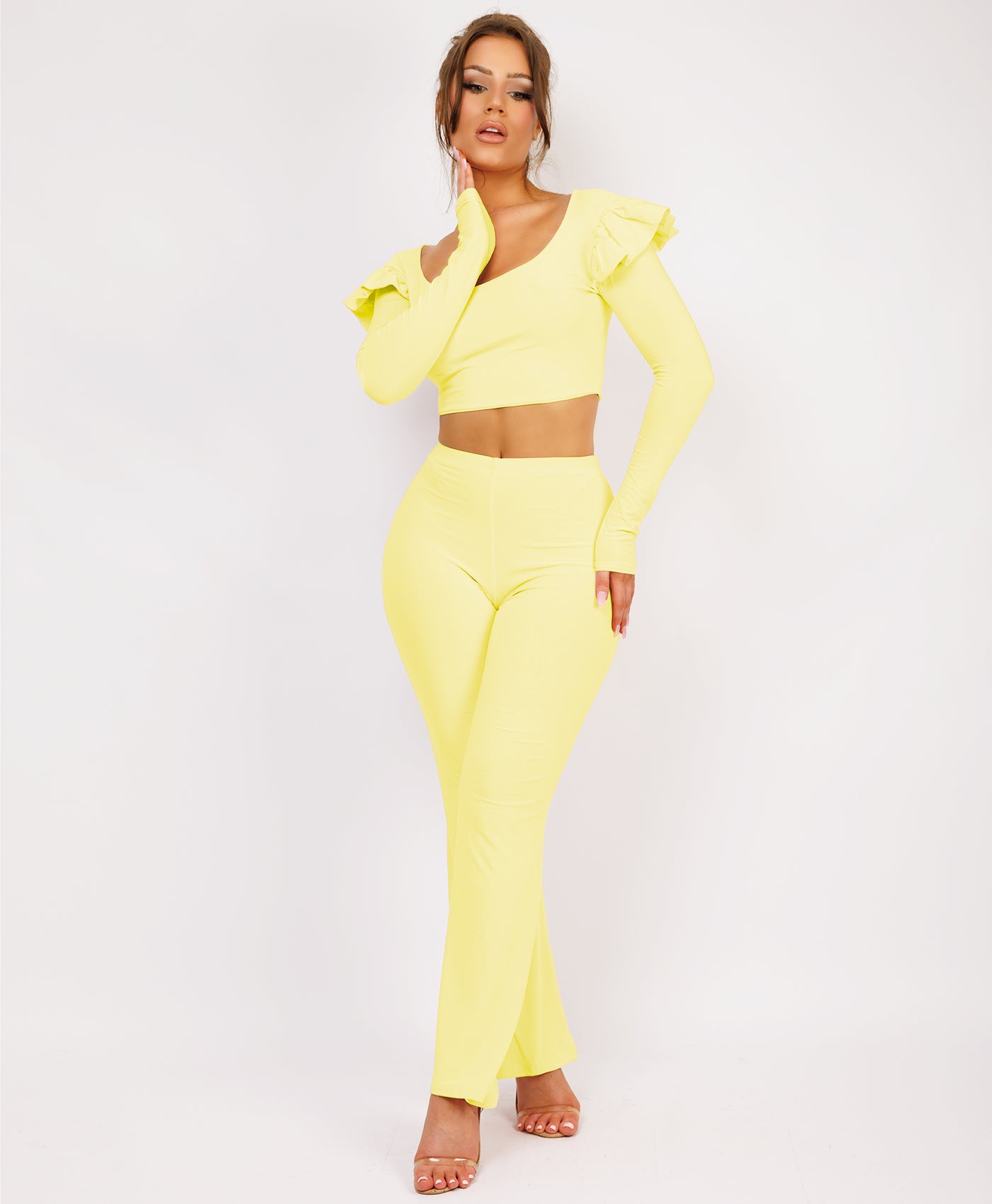 Lemon Frill Shoulder Long Sleeve Slinky Top And Trousers Loungewear Set
