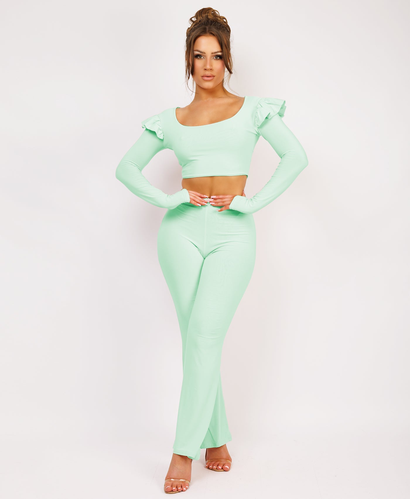 Mint Frill Shoulder Long Sleeve Slinky Top And Trousers Loungewear Set